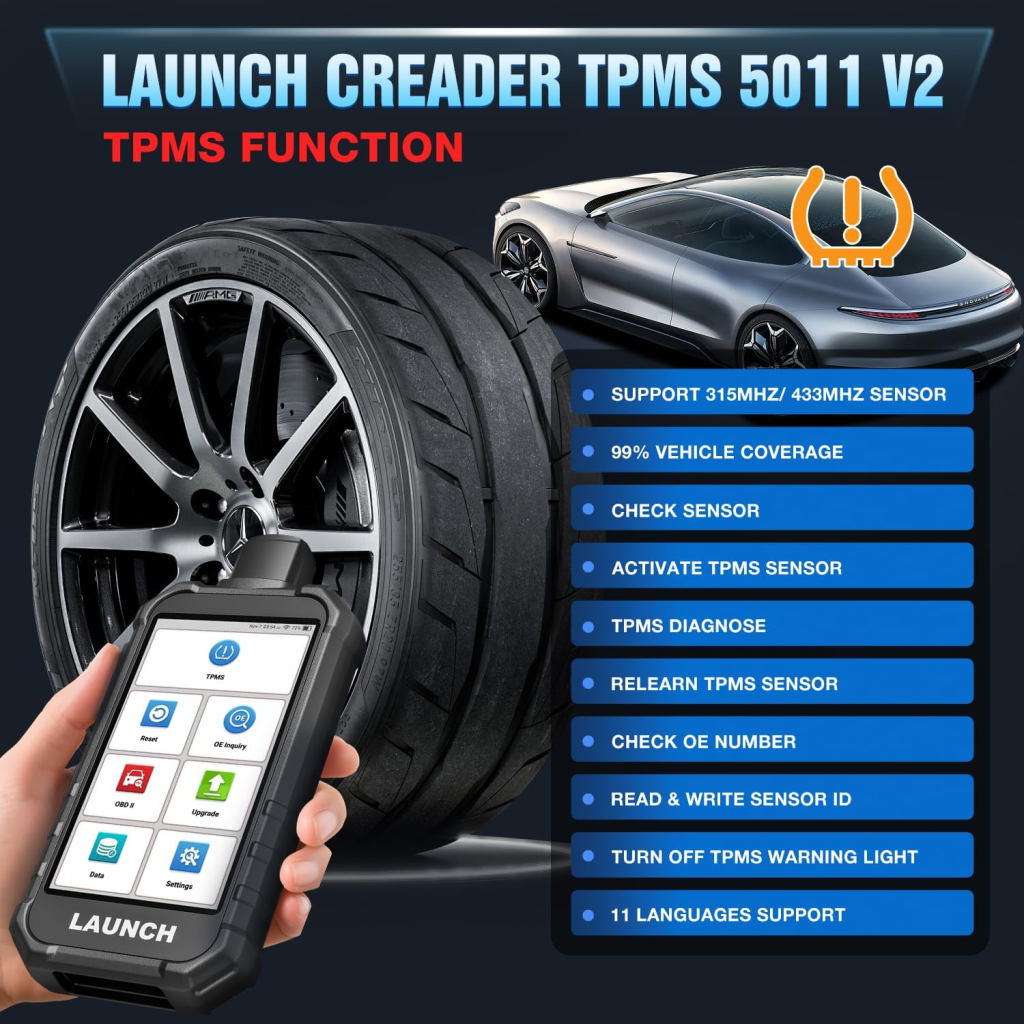 Máquina de diagnóstico profissional Launch Creader TPMS 5011 V2, ideal para oficinas e técnicos que trabalham com sistemas de pressão de pneus (TPMS). Equipamento completo com funções OBD2, ativação, programação e reaprendizagem de sensores TPMS.