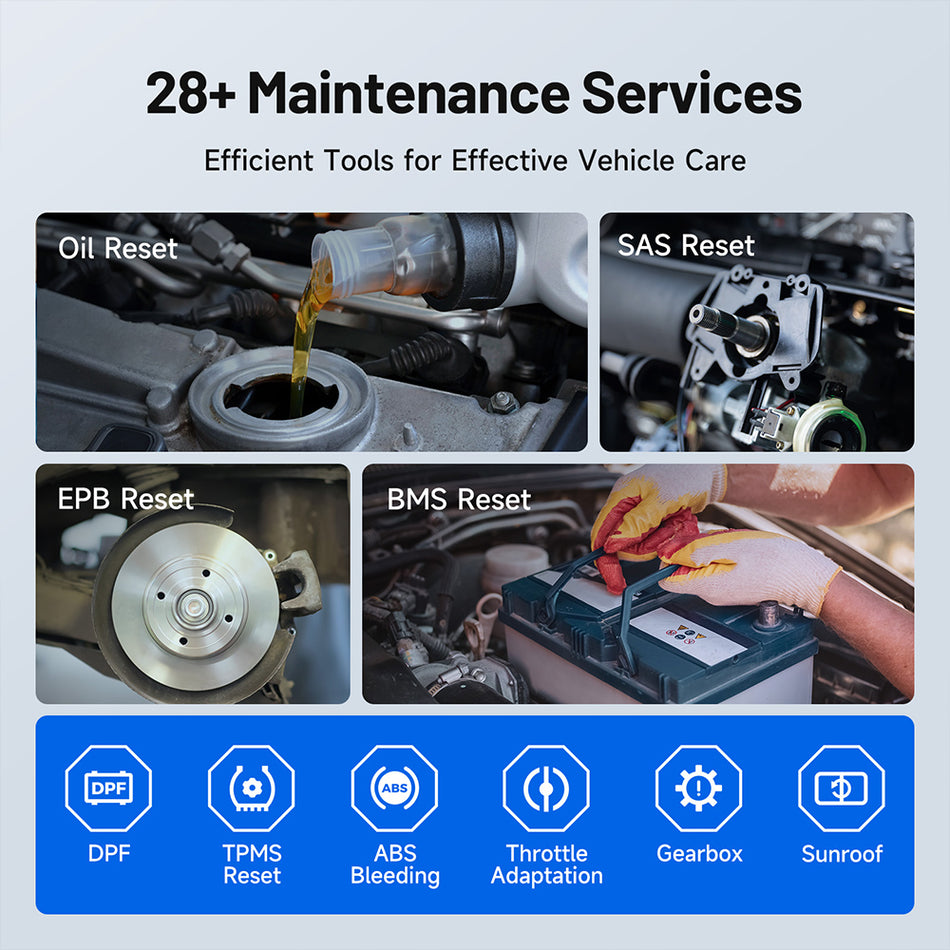 Inclui reset de luz de serviço, registo de bateria, regeneração DPF, calibração do ângulo da direção, travão de estacionamento, entre outros.